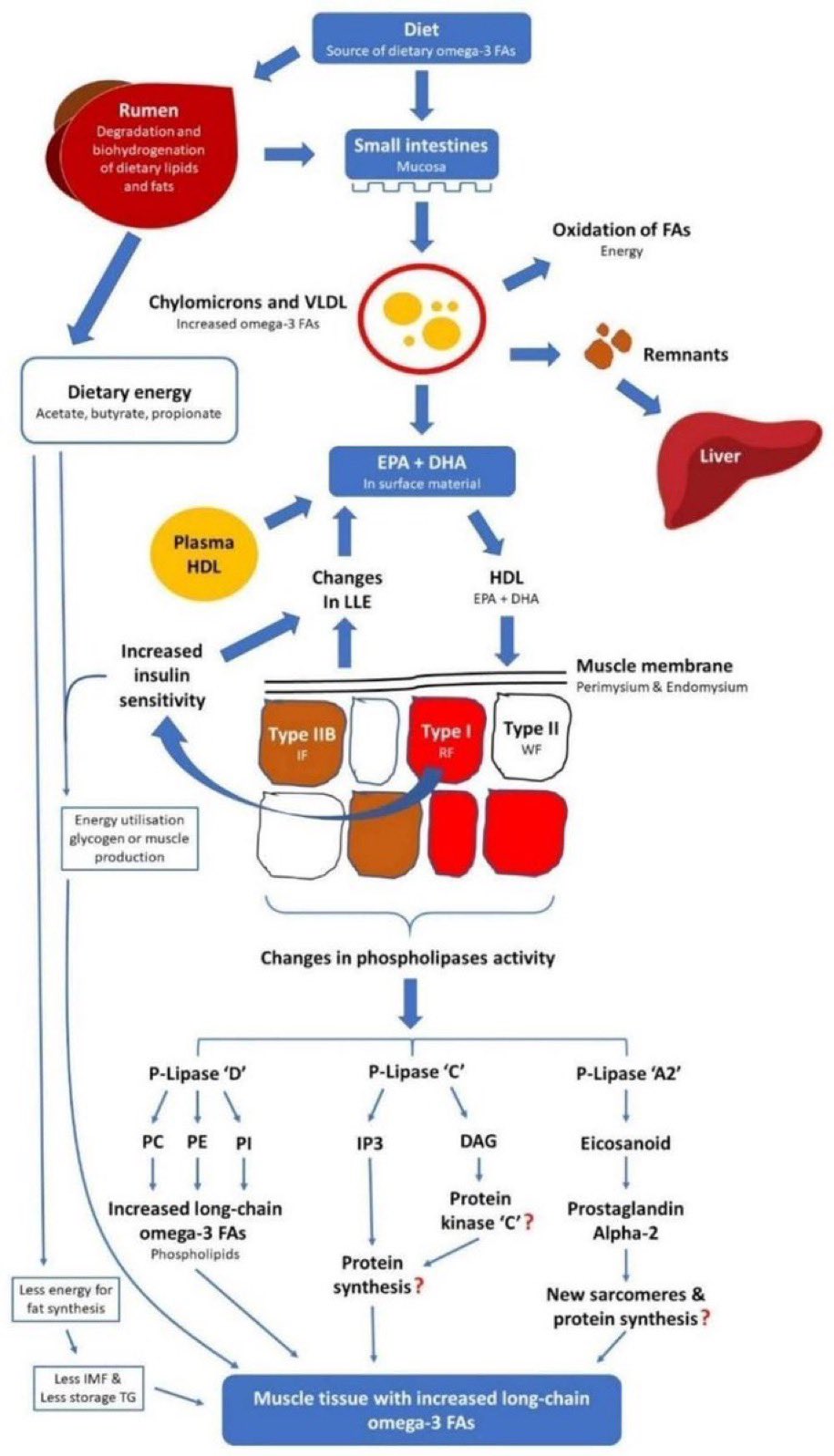 À partir de là, l'EPA et le DHA se retrouvent dans les particules HDL, le plasma et finalement... les membranes musculaires elles-mêmes.