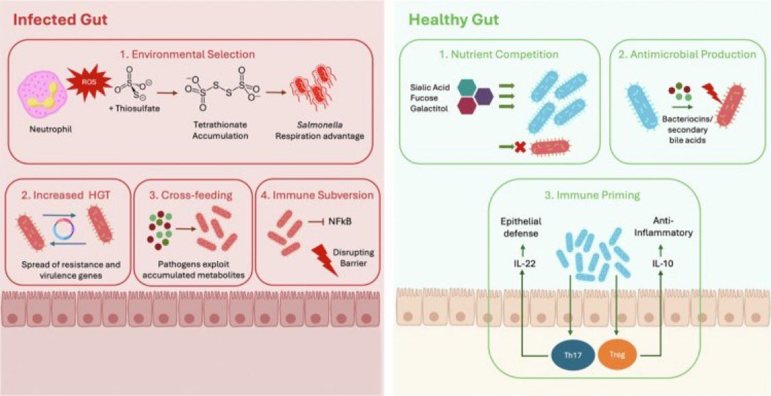 (4) une subversion immunitaire via l’inflammation médiée par NF-κB et la rupture de la barrière épithéliale.À l’opposé, Dans un intestin sain (à droite), le microbiome limite la colonisation par les pathogènes grâce à :