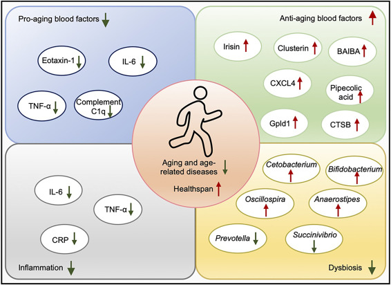 L'exercice physique diminue les facteurs circulants liés au vieillissement et aux maladies, tels que l'IL 6, le TNF-α, l'éotaxine 1, la CRP et le complément C1q.