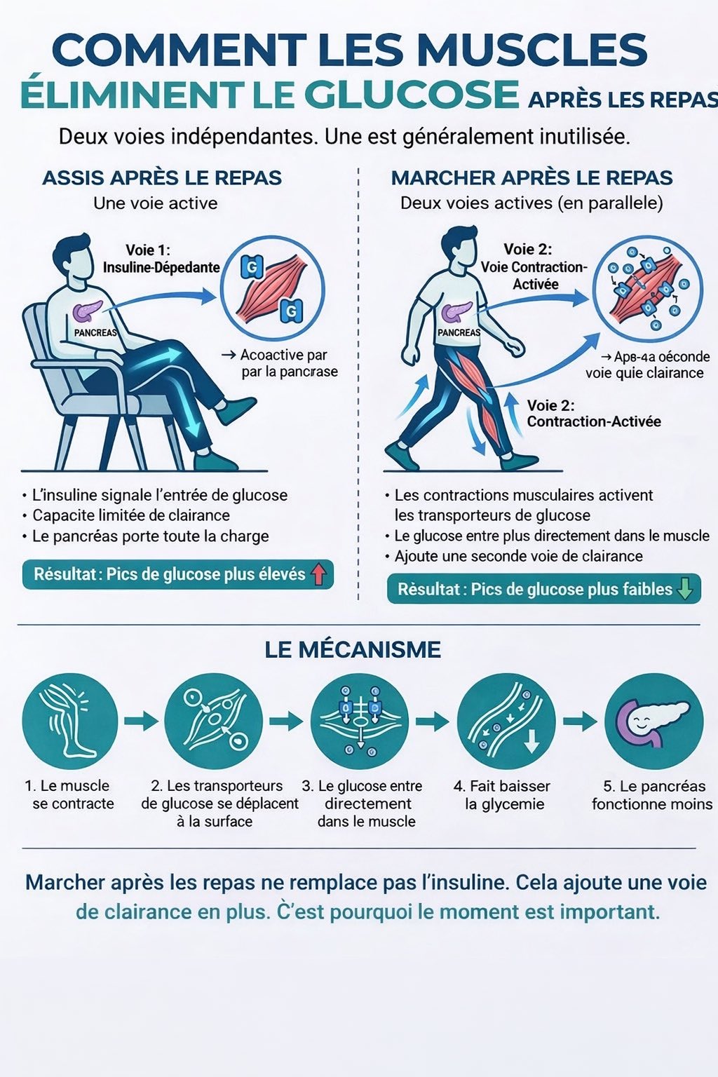 Il ne s'agit pas de brûler des calories ni de « mériter » de la nourriture. Il s'agit d'utiliser les mécanismes physiologiques existants. Marcher après les repas ne remplace pas l'insuline ; cela ajoute simplement une voie d'élimination supplémentaire.